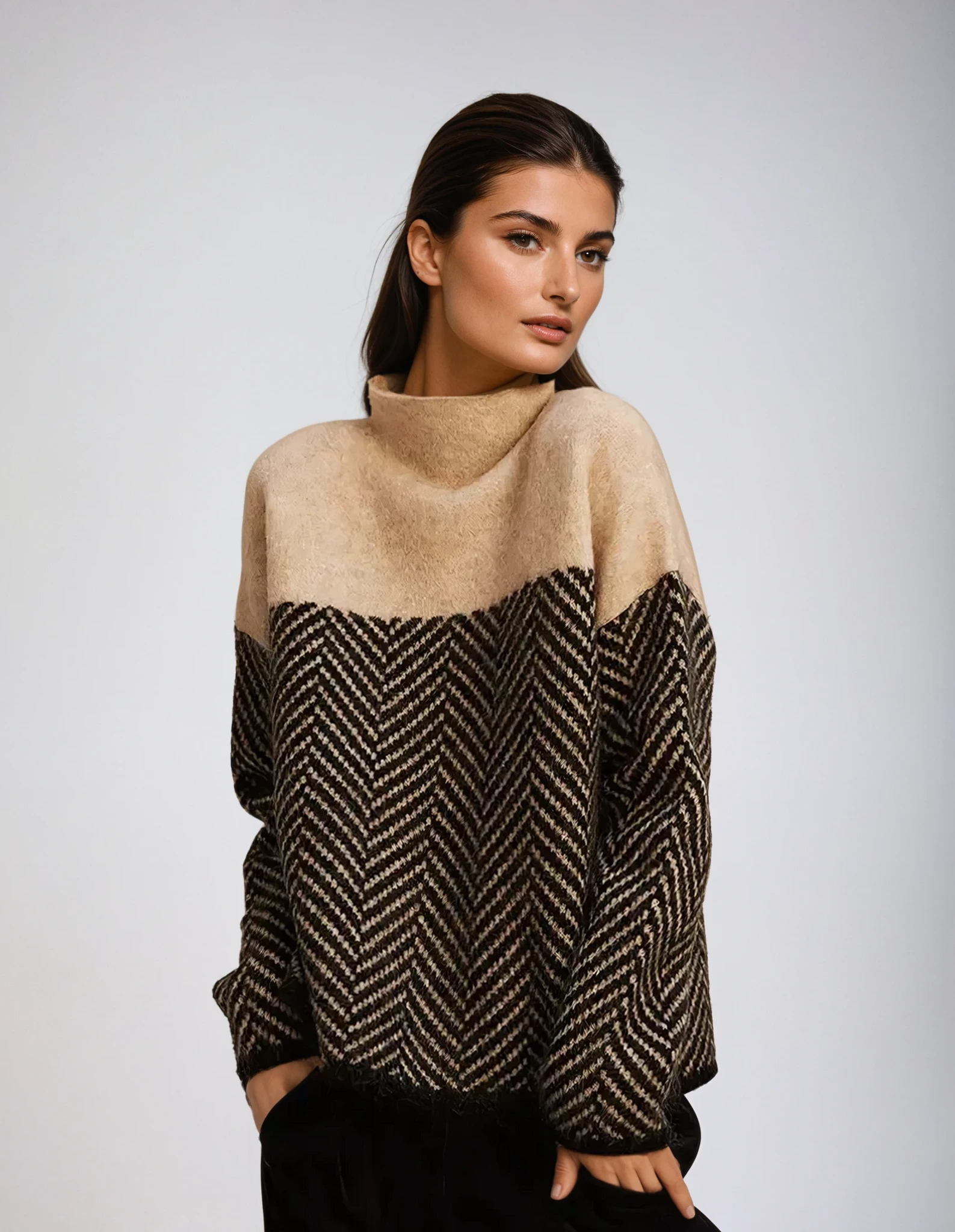 Denne rullekrave, fremstillet af fint snoet materiale, føles luksuriøs, blød og behagelig mod huden – perfekt til dem, der sætter pris på eksklusive teksturer. Med sit elegante sildebensmønster bliver den et uundværligt element i din garderobe. Oplev komfort fra hals til håndled.