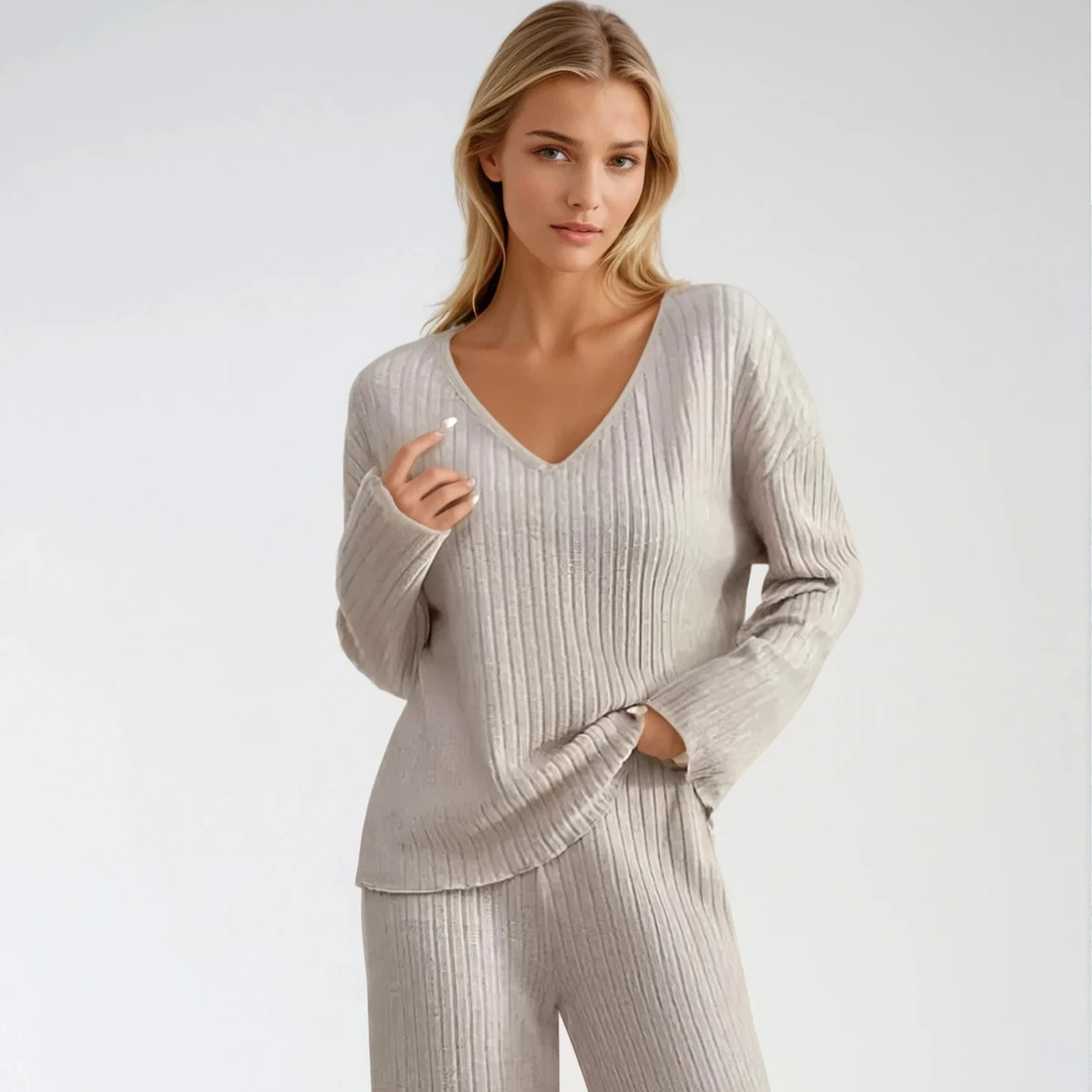 Elise™ kombinerer stilfuldt design med ultimativ komfort. Dette ribstrikkede todelte sæt er fremstillet af blødt, behageligt polyester og nylon, der føles skønt mod huden. Med sin afslappede pasform er Elise™ perfekt både til hyggelige dage derhjemme og en elegant hverdagsstil.